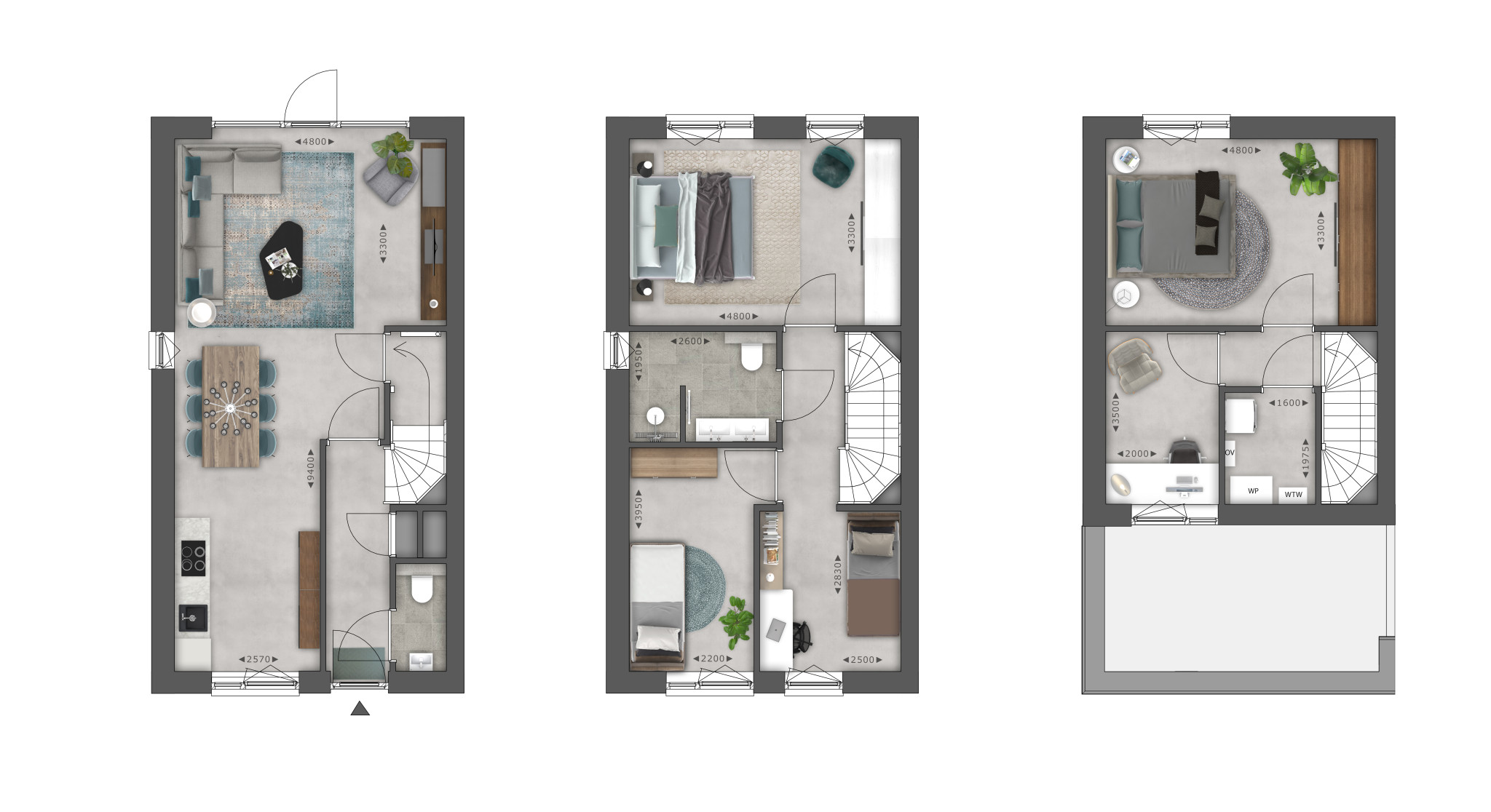 De woningen variëren in woonoppervlak van circa 116 m² tot maar liefst 165 m². Binnen vind je een comfortabele leefruimte met een open woonkeuken en een tuingerichte woonkamer met openslaande deuren. Afhankelijk van het type heb je de beschikking over vijf slaapkamers, een ruime badkamer met inloopdouche, dubbele wastafel en toilet. De woningen zijn praktisch ingedeeld en bieden ruimte aan gezinnen, thuiswerkers en iedereen die comfortabel wil wonen.